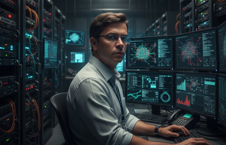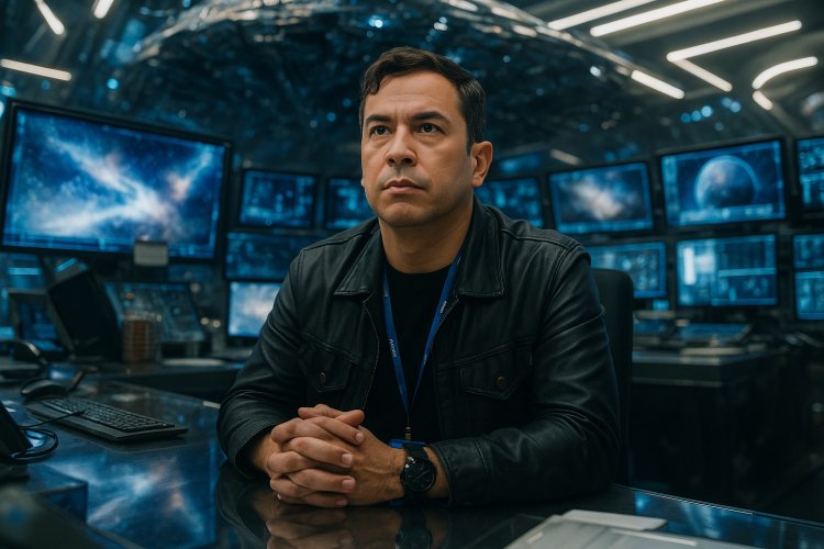 Entre telas e algoritmos, a imagem retrata a serenidade e o domínio técnico de um profissional que lidera a inovação com propósito e precisão.